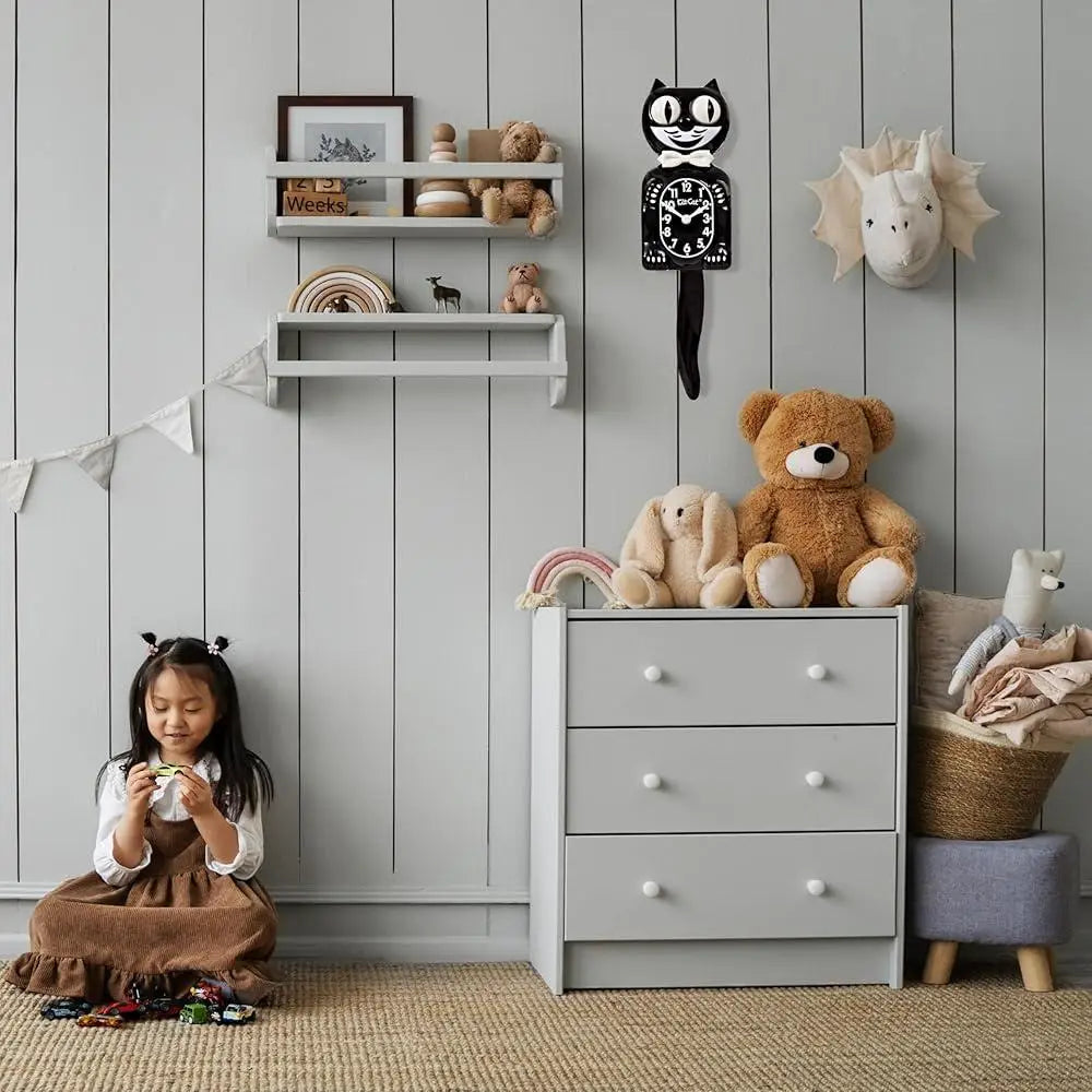 About this item Measuring at 15. 5 inches ears to tail this is the Original Size Kit-Cat Klock This is the Classic Black Kit Cat Klock manufactured since 1932 Featuring the famous rolling eyes, wagging tail, and contagious smile - Runs on 2 C batteries, not included