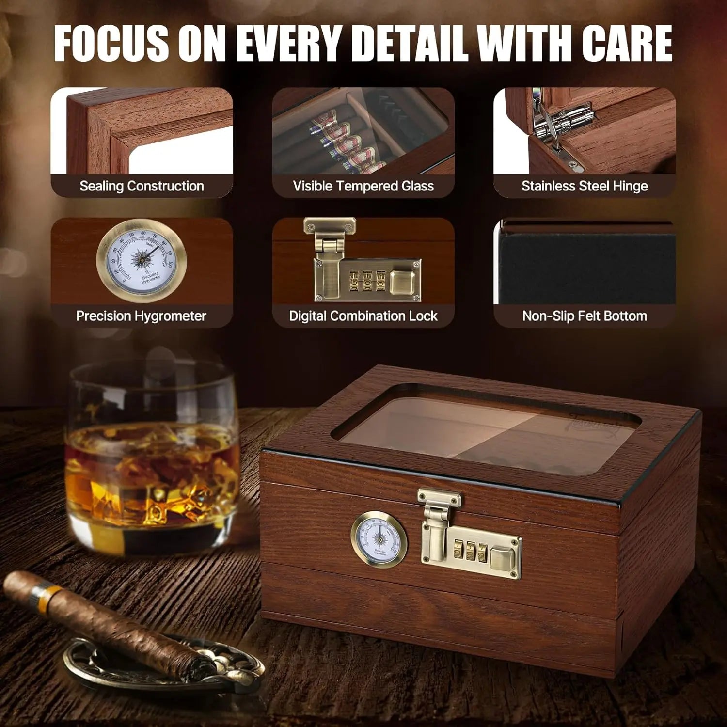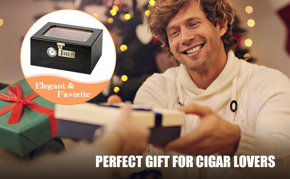 【Quality Crafted Construction】This cigar humidor is handcrafted from cedar wood and has been carefully polished to make it feel smooth and strong. The interior of the cigar case is made of silver stainless steel hinge, which can be flexibly opened at 90 degrees for good sealing. The top is visually tempered glass, so you can display your treasured cigars without opening the lid.