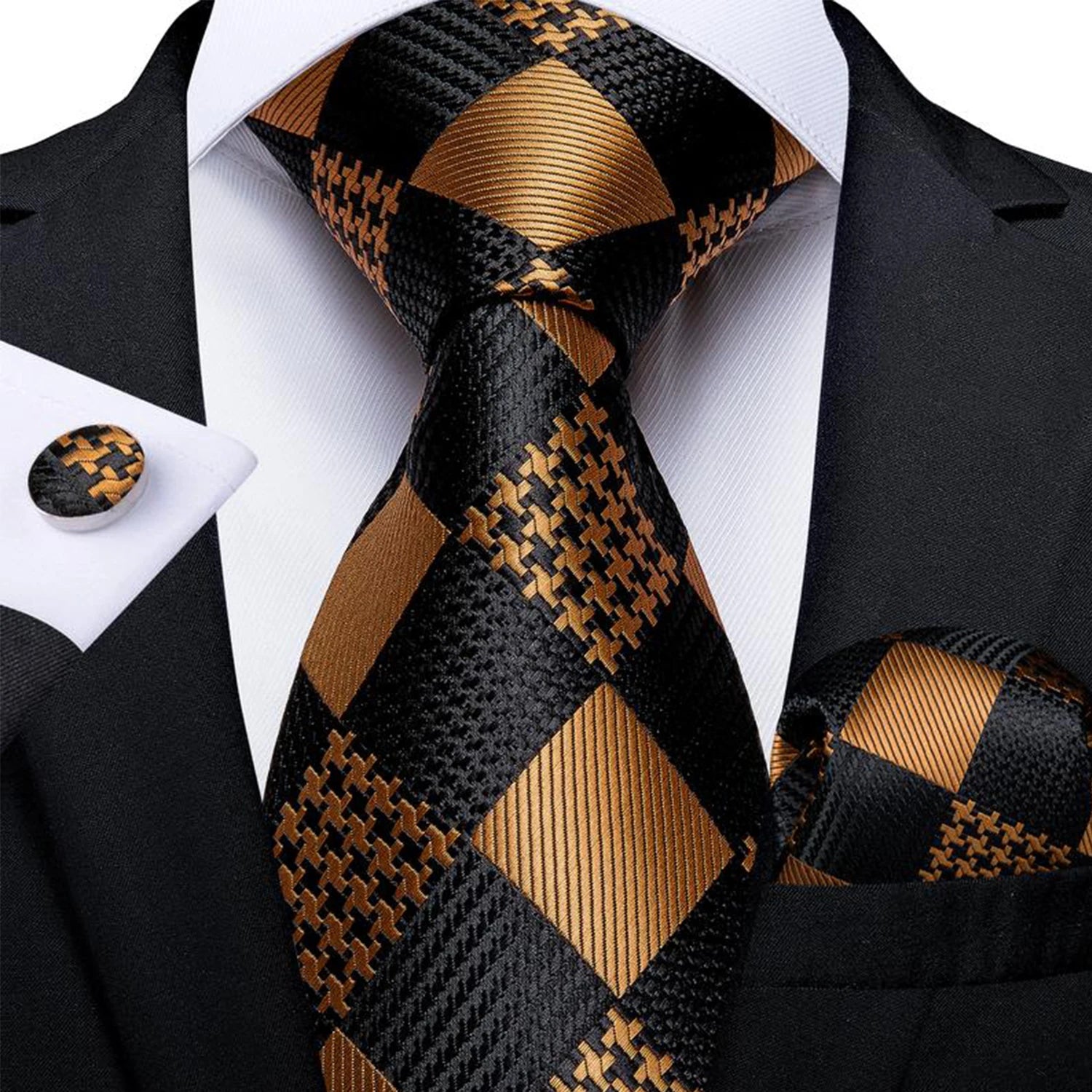 Luxury Mens Tie Black Golden Jacquard Necktie Pocket Square Cufflinks