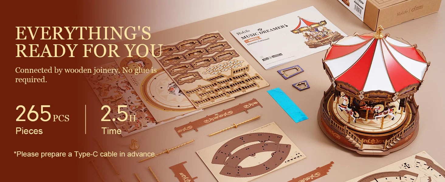 Robotime 3D Wooden Puzzle - Carousel Music Box With LED Lights