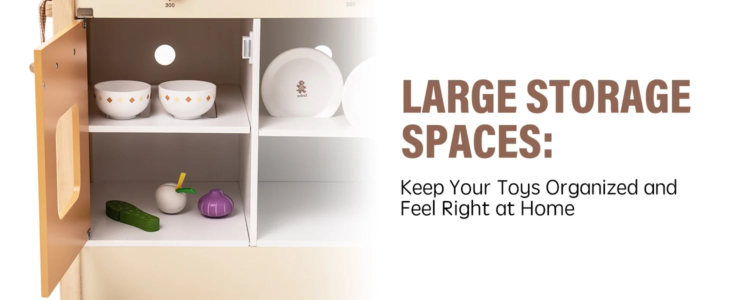 Durable, Eco-Friendly Materials:Made from a combination of MDF and solid wood, our kitchen set is both environmentally friendly and non-toxic, adhering to the highest safety standards, including ASTM F963 and CPSIA certifications. Unlike plastic play kitchens, our wooden set is designed for long-lasting durability and structural stability, ensuring your child’s kitchen can withstand years of fun.